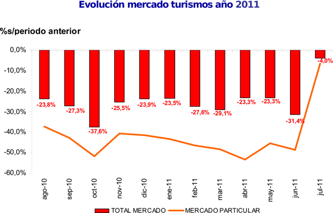 Desde julio de 2010 el mercado de turismos y todoterrenos en España ha ido cayendo a un ritmo de más del 20%, mes a mes, comparando con el año anterior. La tendencia se ha estabilizado un poco, porque de julio de 2011 a julio de 2010 solo ha caído el mercado un 4%. ¿Tiempo de sacar el champán? Esto… no.