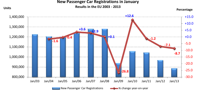 Este gráfico muestra las variaciones año-año (interanual) de los últimos 10 meses de enero en la Unión Europea. El batacazo es gordo (-8,5%) pero porcentualmente dolió más enero de 2009. Ahora bien, por volumen, 918.820 unidades (UE + EFTA - Malta) en un mes es el peor resultado desde enero de hace 23 años.
