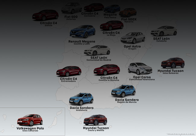 De la misma forma que hemos especificado entre países europeos... ¿qué hay de las autonomías españolas? También tienen sus favoritos. El gran ganador es el Citroën C4, aunque el Seat León se corona en la Comunidad de Madrid y en Catalunya. Así queda el mapa completo (idéntico al que encabeza este artículo) con los datos facilitados por ANFAC para el período de enero a septiembre de 2017.