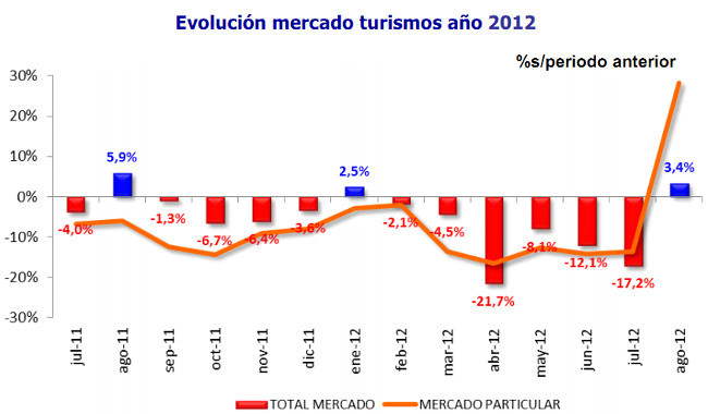 Como vaticinaban las previsiones, muchos clientes particulares han adelantado sus compras de turismos en agosto ante la subida del IVA, provocando un incremento puntual de ventas del 3,4%. Sin embargo, este aumento es un espejismo. La caída acumulada respecto del ejercicio anterior es del 8,5% y las previsiones de ventas se mantienen por debajo de las 700.000 unidades.