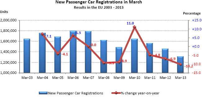 Este año tiene toda la pinta de seguir siendo _annus horribilis_ para las marcas en Europa. Con el mes de marzo de 2013 van 18 meses consecutivos de caídas en las ventas de turismos y todoterrenos en este importante mercado. Si comparamos con el primer trimestre de 2013, las ventas caen un 9,8%.