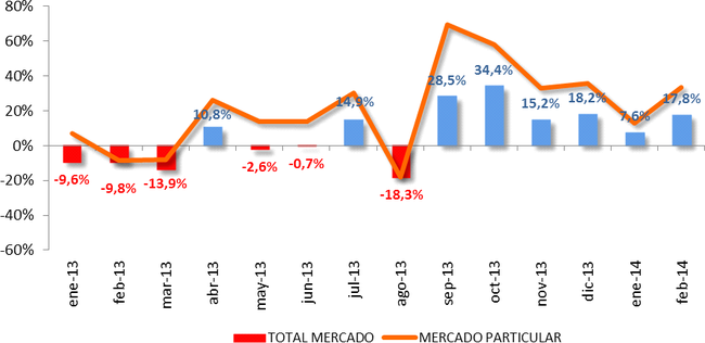 El mes pasado fue realmente bueno para el mercado español, con un aumento del 17,8% respecto a febrero de 2013, cuando también había ayudas del Gobierno a la compra de coches. Hablamos de 68.763 unidades frente a las 58.372 de febrero de 2012. En el acumulado anual va un 13,1%.