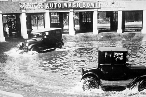 Faltaban muchos años para que se popularizaran los actuales centros de lavado con mangueras a presión, pero pronto se entendió que para tener el coche limpio habría que invertir mucho ingenio... y mucha agua. El Automobile Washbowl de Chicago (Illinois, Estados Unidos) no era exactamente un túnel de lavado, sino un lavadero instalado en medio de una plaza inundada. Corría el año 1924.