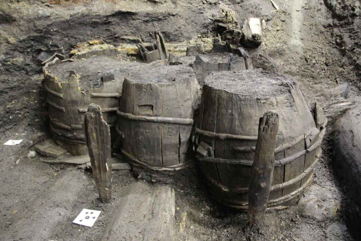 Picando suelo para acceder a las tuberías, encontraron tres barriles de roble casi intactos. No estaban allí por casualidad: se trataba de un almacén de mezcla de mortero. Resulta que los constructores enterraban los recipientes para conservar los materiales de obra.