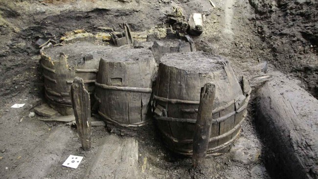 Picando suelo para acceder a las tuberías, encontraron tres barriles de roble casi intactos. No estaban allí por casualidad: se trataba de un almacén de mezcla de mortero. Resulta que los constructores enterraban los recipientes para conservar los materiales de obra.
