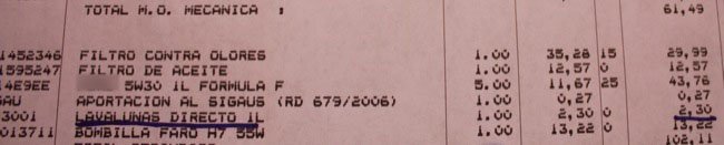El trato en el concesionario es perfecto, me explican cuánto me cobrarán y qué operaciones realizarán. Al entregarme la factura me explican de nuevo los detalles, que incluyen 2,3 euros por un litro del líquido. Esto sin sumar IVA, total 3,68 2,66 euros por una operación que no han realizado. Eso sin tener en cuenta que por ese precio el líquido podría ser Vichy Catalan mezclada con jabón de Anne Semonin.