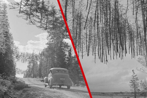 Atados con cables a otros árboles. Un coche circula por una carretera a pocos kilómetros de la frontera soviética. Y sobre él, decenas de coníferas flotan en el aire. Uno de los que lo inmortalizó fue Osvald Hedenström, fotógrafo que luchó en el bando finlandés en este largo conflicto armado. Esta imagen se replicaba a lo largo de kilómetros de las entonces rudimentarias vías del país.