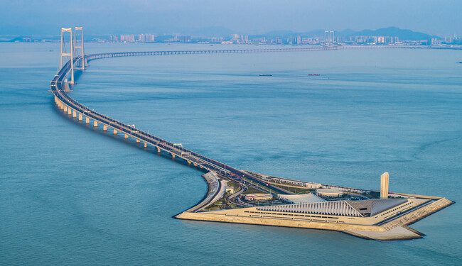 El enlace Shenzhen-Zhongshan en China es una de las mayores y avanzadas obras de ingeniería vial del mundo: se trata de la primera infraestructura marítima que combina puentes, islas artificiales, un túnel y intercambiador submarino. Con un trazado de 24 kilómetros, ostenta 10 récords mundiales y tecnología de vanguardia, hasta el punto de que su túnel está monitorizado por robots.