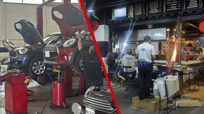 Una esquina de este taller mecánico se convierte en restaurante al final del día