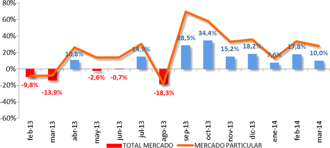Por canales, el particular está _on-fire_, en lo que va de año son 105.167 unidades, un 24,7% más que en 2013, y también había PIVE. El canal empresas también quedó en positivo con un 7,5% de incremento, y las empresas alquiladoras llegaron al 5,8% verde. Como la semana santa cae más tarde, se ha producido un desajuste.