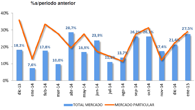 Enero supuso un fuerte nivel de crecimiento para todos los canales. El canal de Particulares consolidó la tendencia alcista que se dibujó a lo largo de todo el año pasado y aumentó más el ritmo de crecimiento, de un modo similar a lo que hizo el canal de flotas de Empresas. Por su parte el canal Empresas de alquiler duplicó ampliamente en este mes de enero el nivel de crecimiento registrado en 2014, acaso recuperando el terreno perdido durante los últimos tiempos.