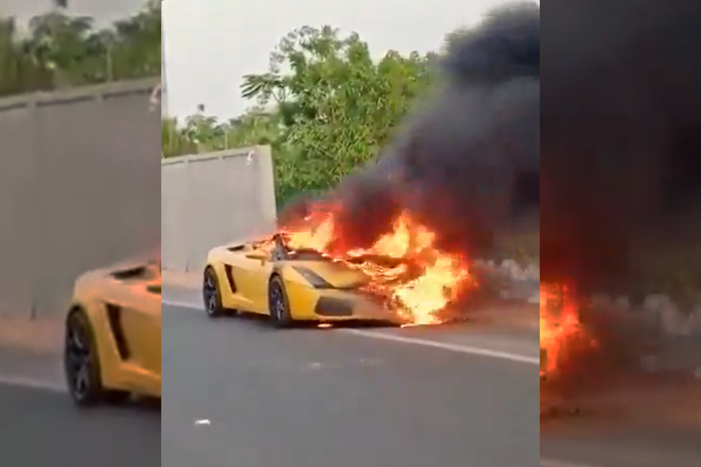 Un vídeo muestra al Lamborghini Gallardo ya envuelto en llamas, con gran parte de su lado izquierdo consumiéndose. El pobre superdeportivo, que acabó completamente calcinado antes de que llegasen los bomberos, está aparcado en un extremo de la calzada, mientras varios conductores lo sortean impasibles mientras arde.