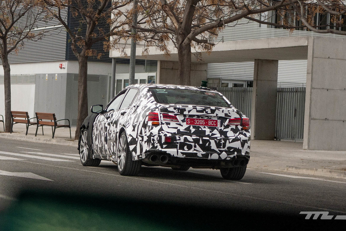 Las cuatro colas de escape sugieren la presencia de un V8 bajo el capó de este ES F. Sin embargo, es evidente que el diseño de la zaga no está fijado, pues no llevaba un camuflaje tan bestia como el frontal.