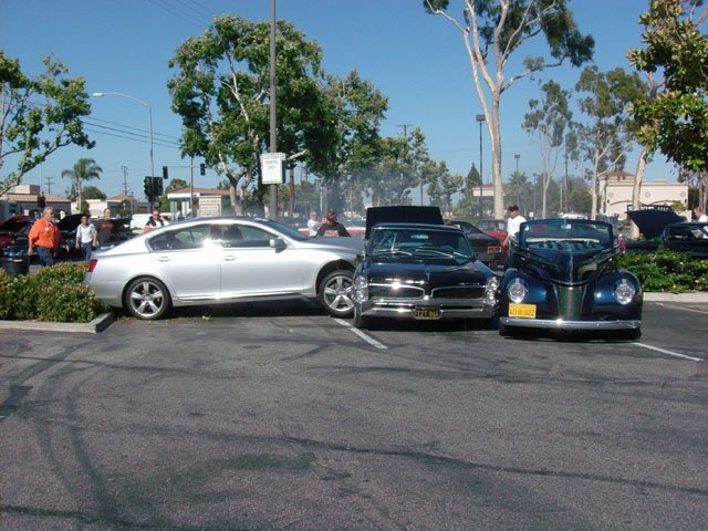 Por lo que le contaron, la conductora del Lexus GS salía de Alondra Boulevard e iba a entrar en el aparcamiento, se vió sorprendida por la cantidad de coches en el aparcamiento y al ir a pisar freno probablemente confundió el freno con el acelerador, pasando por encima de los maceteros y estampándose contra los dos clásicos que estaban aparcados allí.
