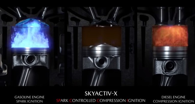 En esta animación podemos ver una comparación entre un motor de gasolina y otro diésel, y cómo combinando las características de los dos se ha creado el método SPCCI. Es un gran explicador visual de cómo este sistema combina el efecto de bola de fuego inducido por chispas en los automóviles de gasolina tradicionales con la "combustión rápida y simultánea en varios puntos" de los motores diésel.