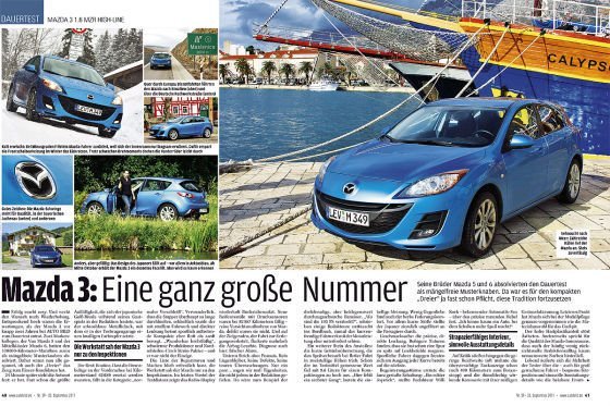 La marca japonesa se enorgullece de haber quedado más que bien en la última prueba de larga duración de la revista alemana Autobild de 100.000 kilómetros. El modelo escogido ha sido un Mazda3 (1.6 105 CV), y el artículo sale hoy a la venta en Alemania en la revista del 30 de septiembre.