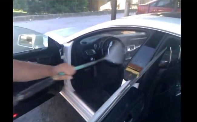 En concreto parece que el propietario encargó el lavado de su coche a este individuo, y el decidió pasárselo muy bien con un amigo fastidiando el coche, que seguramente no volverá a ser el mismo. Rociar con agua a presión el salpicadero no es una de las cosas para las que ningún coche haya sido preparado.