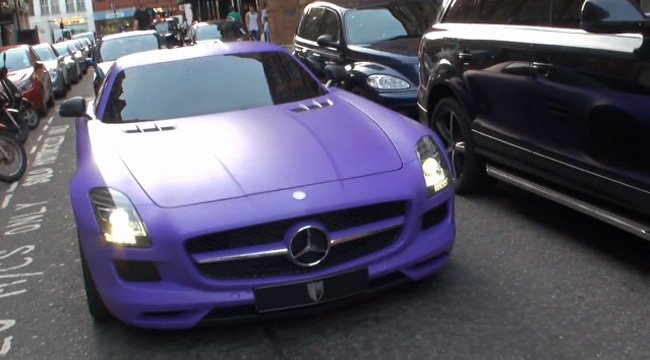 Pero como siempre, los hay que no se conforman con nada y que no consiguen encontrar en el completo configurador del Mercedes SLS AMG ninguna combinación que les satisfaga y deciden hacerselo ellos mismos. Este ha sido el caso de este Mercedes SLS AMG pintado de color púrpura mate, que podemos ver rodando por los alrededores de Harrods en Londres.
