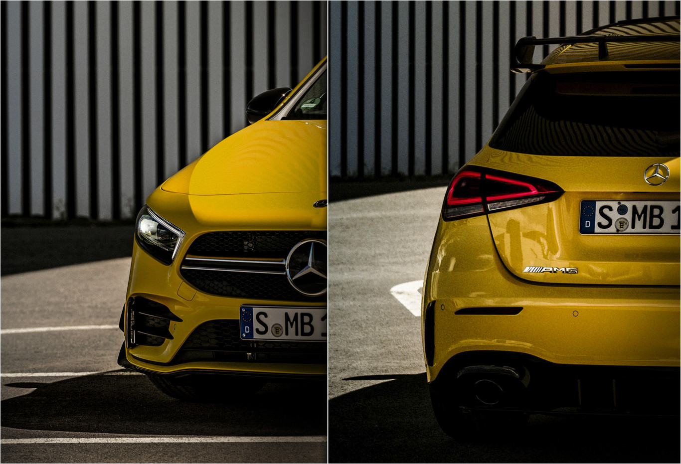 A la vista está el llamativo color amarillo, un kit aerodinámico en negro brillante (spoiler de techo, difusor, aletines delanteros, etc...) o la parrilla frontal "twin-blade", que probablemente en la versión más bestia A 45 dejará paso a la parrilla Panamericana de listones verticales. Por supuesto no faltarán detalles en el interior, así como unos asientos AMG de corte más deportivo, por ejemplo.