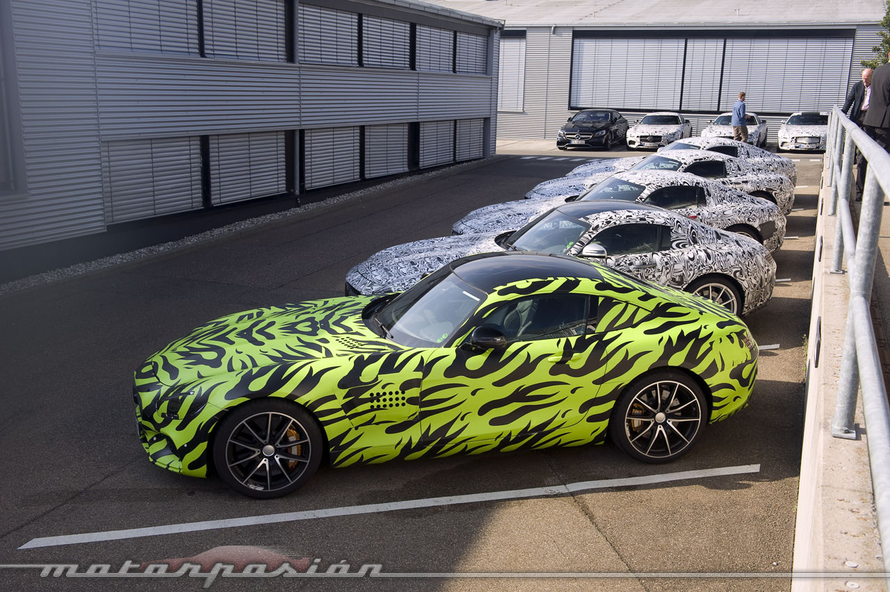 Durante nuestra visita a la sede de AMG en Affalterbach, en la que conocimos más a fondo el modelo, pudimos ver desde quince o veinte mulas de pruebas del GT (ver foto), aún con camuflaje (incluída la unidad en verde y negro que estuvo por Barcelona), hasta la fábrica de motores de la compañía, en la que cada motor es montado de principio a fin por un único empleado, que es el que después, una vez terminado, añade la placa con su propio nombre.