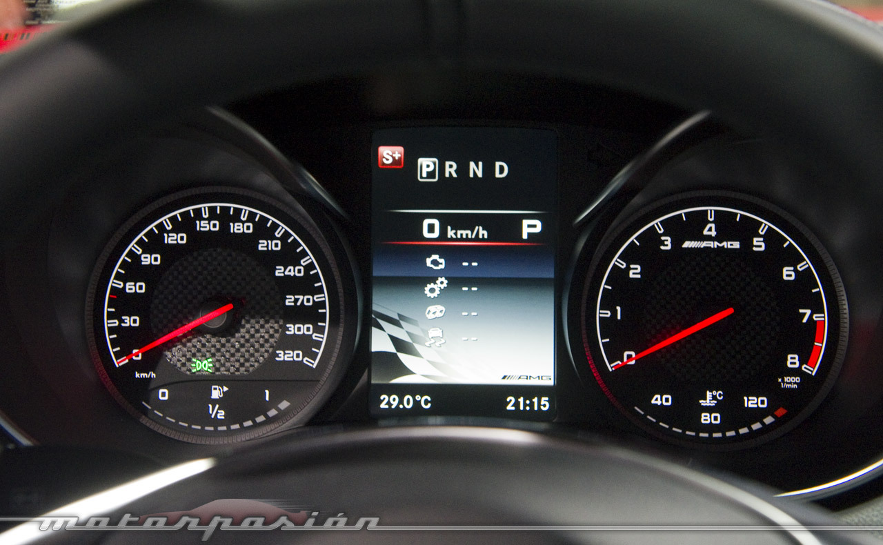El cuadro de instrumentos es bien sencillo y fácil de leer (ver foto). Cuentarrevoluciones en el lado derecho, velocímetro en el izquierdo y una pantalla entre ambos para mostrar todos los datos de interés del ordenador de a bordo como el modo de conducción, el modo del cambio automático, la hora o la temperatura exterior. En la parte inferior de la esfera del velocímetro encontramos el indicador de nivel de combustible, mientras que en la zona inferior del cuentavueltas la información mostrada es la temperatura del agua.