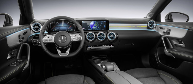Para empezar, el futuro Clase A mantiene el diseño escalonado del salpicadero, aunque ahora toma aún más inspiración del mundo de la aviación, con formas que recuerdan al perfil de un ala y también difusores de aire que están claramente basados en el afterburner o postquemador de una turbina, y que además pueden estar retroiluminados de manera opcional.