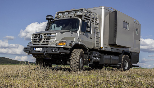 Fabricado por Mercedes-Benz en colaboración con el carrocero Hartmann Spezialkarosserien y el especialista en interiores Hünerkopf, este Zetros cuenta con un cajón de carga convertido en vivienda que mide 5,6 metros de largo y 2,4 metros de ancho. Además, un módulo extraíble eléctrico en el lado del conductor amplía hasta los 2,5 metros la anchura de la zona de vivienda.