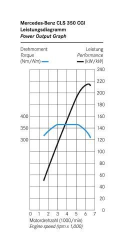 El menos potente es el del CLS 350 CGI, completamente nuevo, un 6 cilindros de 292 CV que utiliza un sistema de inyección directa que aumenta su eficiencia termodinámica y reduce las emisiones contaminantes. Alcanza 250 km/h y acelera de 0 a 100 km/h en 6.7 segundos. El consumo medio es de 9.3 litros a los 100 km, un 10% menos que los anteriores V6 de inyección directa.