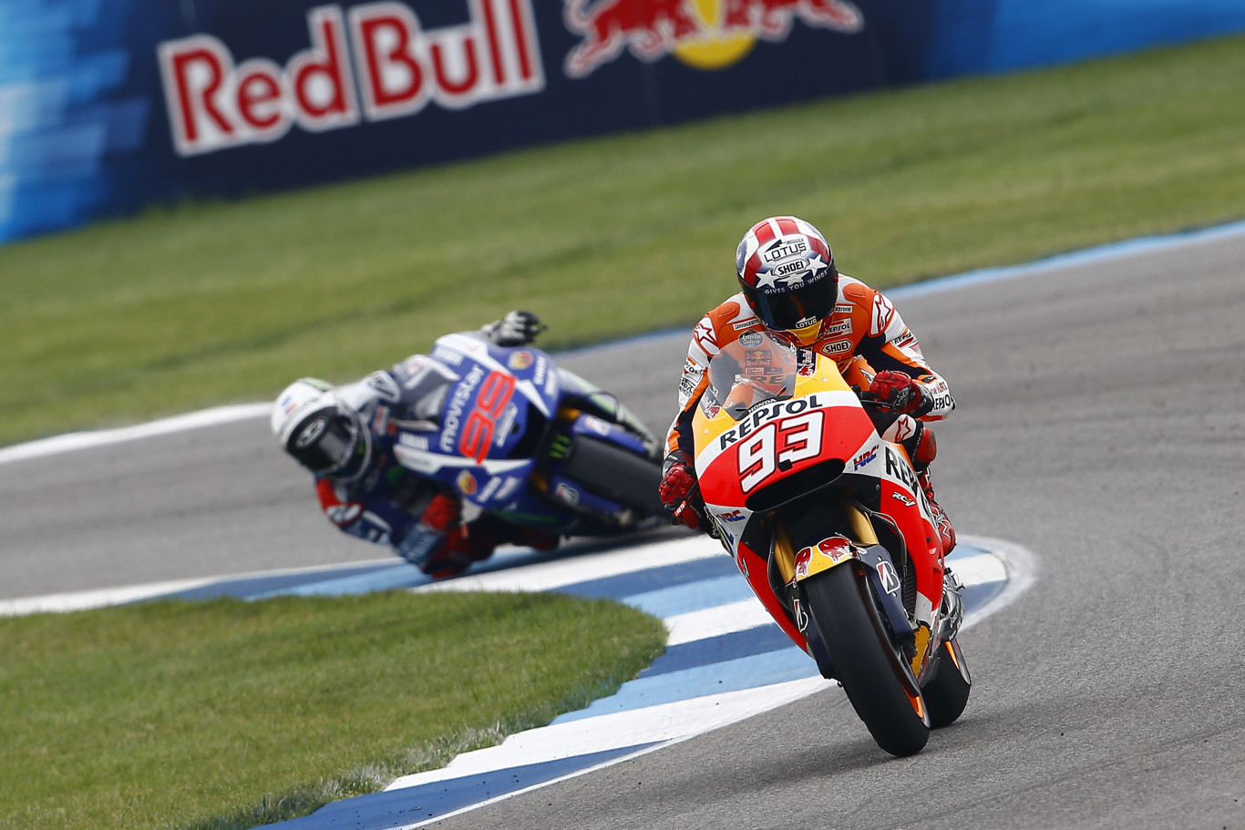 Hace tan sólo unas horas, Marc Márquez ha sumado la victoria número 700 de Honda en el campeonato del mundo. Lo ha hecho tras superar a Jorge Lorenzo (segundo) en el Gran Premio de Indianápolis, gracias a haber sido capaz de mantener el alto ritmo del piloto mallorquín y haberse guardado un pequeño as para el final. El último escalón del podio lo ha ocupado Valentino Rossi, a casi seis segundos del duo español. Tanto Jorge como Marc consiguen recortar puntos con el líder del campeonato y, de hecho, el del Repsol Honda se sitúa ya en tercera posición de la general, 59 puntos por debajo de Rossi. Álex Rins triunfó en una entretenida carrera de Moto2 y Livio Loi sumó su primera victoria en Moto3.