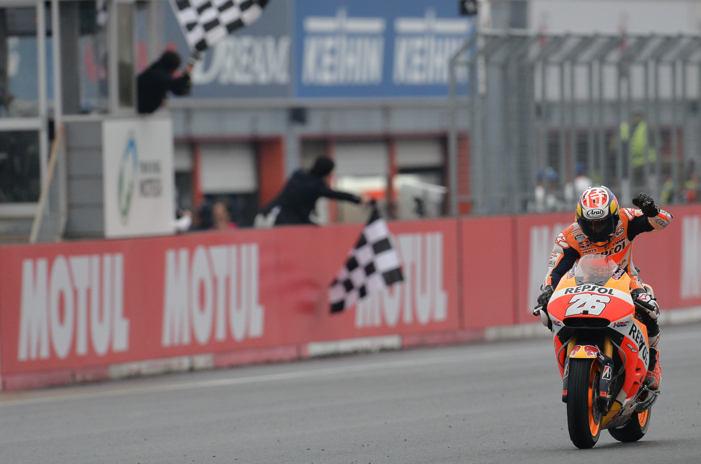 Dani Pedrosa, tras haberse lucido en Motorland Aragón, confesaba llegar con un extra de motivación al Gran Premio de Japón en Motegi. Las cosas no pintaban muy bien para el piloto de Honda y en los entrenamientos cronometrados no llegó a poder competir con los pilotos de Yamaha, jugándose el título. Sin embargo, la situación cambió radicalmente cuando la lluvia hizo acto de presencia en carrera. Dani Pedrosa pudo regular el uso de sus gomas para, en los últimos giros, poder superar a Jorge Lorenzo y Valentino Rossi, que sufrían de un claro desgaste en el en tren delantero. Victoria número 50 de Dani y Valentino Rossi un poquito más líder tras superar a Jorge.