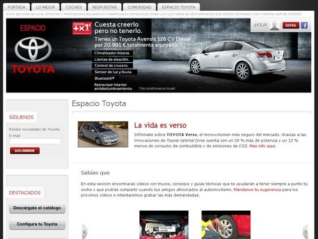 Desde hoy, si os fijáis en las pestañas de la parte superior de la cabecera de Motorpasión, os encontraréis con un rincón que llega para ser un punto de encuentro e información para todos los que quieran saber más sobre Toyota. Se trata del Espacio Toyota que, como su propio nombre indica, reunirá en su interior mucha información de interés sobre la marca japonesa. Es la primera marca de coches que tiene su propio espacio desde el que comunicar a toda la comunidad de Motorpasión sus productos, novedades, ofertas, etc.
