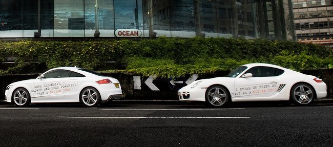 ¿Qué pasa si un día por la calle te encuentras un Audi TTS que pone en su puerta “Soy más caro, más lento y menos potente que un Nissan 370Z“? ¿Y si es un Porsche Cayman que tiene escrito “Sueño con ser tan rápido como un Nissan 370Z“? Pues es real, al menos, en Londres.