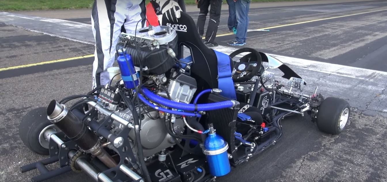 El kart protagonista de este vídeo lleva tras el asiento el motor de una moto, de una Honda CBR 1000 RR subido hasta los 230 CV de potencia gracias entre otras cosas a esa botella de color azul que luce en el costado derecho.