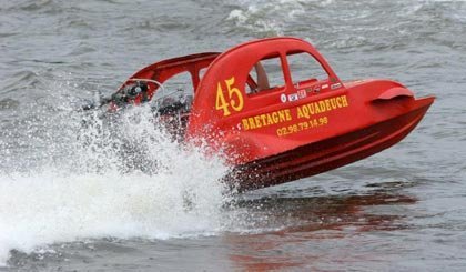 Un grupo de amigos del nordeste de Francia se han montado sus viejas 2CV sobre una plataforma de plástico con forma de barca, le han dado la vuelta al motor de las 2CV y le han instalado un turbo que sube la potencia hasta los 130 CV. Y con sus nuevas “lanchas de competición” se dedican a organizar carreras e incluso han llegado a atrevesar el canal de la Mancha.