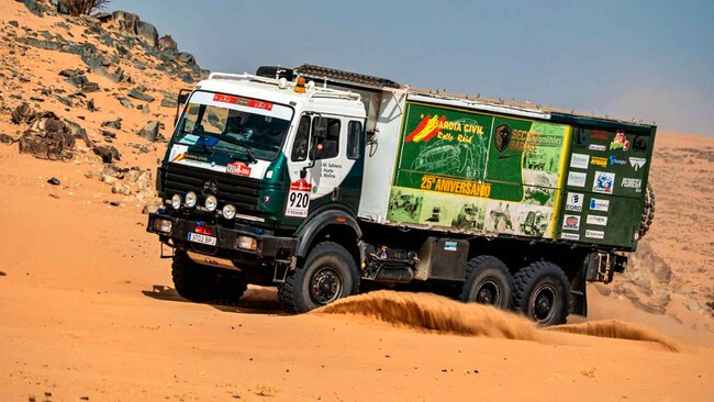 Con José Manuel Salinero a sus mandos y Javier Benito de copiloto, este Mercedes 2644 6x6 de los años 90 ha sido la montura del equipo Guardia Civil Rally Raid. En el Dakar Classic se premia sobre todo la resistencia y en todo tipo de terrenos, desde arenosas dunas hasta exigentes pendientes llenas de piedras.