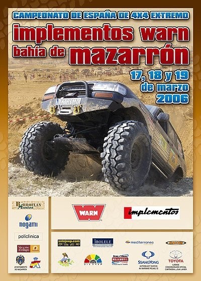 Los próximos 17, 18 y 19 de marzo se celebrará en las minas de Mazarrón el trial Implementos Warn Bahía de Mazarrón, la primera prueba puntuable del Campeonato de España de 4×4 Extremo, organizada por el club Barroflan, patrocinada por Implementos y avalada por la Real Federación Española de Automovilismo. A ella van a acudir los mejores equipos y pilotos de España, como David Peirote o Santiago Bravo, dos equipos que he tenido la oportunidad de ver en directo y que con sus máquinas son capaces de pasar por cualquier zona, por muy díficil que parezca.