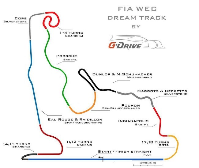 En esta ocasión, es el equipo ruso G-Drive Racing el que se ha atrevido a dibujar sobre un mapa lo que ellos consideran el circuito de los sueños del mundial de resistencia. Aunque las curvas escogidas son realmente espectaculares en su mayoría, creo que deben hacerse algunos matices a la combinación escogida.