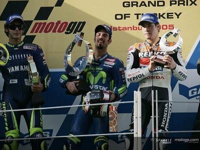 Una carrera perfecta desde la salida ha llevado a Marco Melandri a la victoria en el Gran Premio de Turquía esta mañana. Al contrario, Sete Gibernau, terminó cuarto saliendo desde la pole position y entró en la meta a doce segundos de la cabeza. El campeón Valentino Rossi hizo una salida mala y tuvo que emplearse a fondo para auparse al segundo escalón del podium, por delante de Hayden. “Adelantar a Melandri hubiera sido difícil”, declaró Rossi, y se veía bien claro que Melandri era ciertamente más rápido que el de Yamaha en algunas partes del circuito.