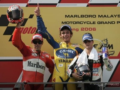 Un Gran Premio de Malasia que comenzó con la suspensión de la sesión clasificatoria por lluvias torrenciales ha terminado muy bien. Inmejorablemente, diría yo. En MotoGP, Rossi salía en la pole, mientras que sus rivales Hayden y Pedrosa lo hacían desde la segunda y quinta posición respectivamente. Aparecía de nuevo Sete Gibernau, ausente desde hace tiempo ya por aquella lesión y sus consecuencias, y Capirossi salía desde la tercera posición.