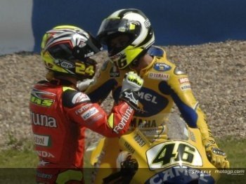 Rossi sabía que la carrera de Jerez iba a ser dificil, pero ¿tanto? En la primera curva estaba en el suelo por impacto directo de Toni Elías, posteriormente cuarto al final de la carrera, y tuvo que empezar de nuevo desde el último puesto para remontar hasta el catorce, quedando a unos 25 segundos de Carlos Checa. Eso es remontar casi, casi un minuto con respecto a la cabeza, ya que oficialmente Rossi tardó en recoger la moto y reemprender la carrera unos 30 segundos, y aún lo vimos rodar renqueante un ratito. Así que la carrera de Rossi, bastante jorobada. Con respecto a lo de Elías, parece que han quedado tan amigos, pues Rossi dice que Toni “es un buen piloto”, y que le dijo que no se preocupase, pero que “la próxima vez que se acuerde de frenar, y si no le da tiempo, que choque con otro!”. Este Rossi… Este año no tiene las cosas de cara, aunque ya veremos cómo reacciona después de Jerez.