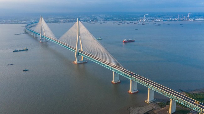 El puente Sutong sobrevuela el río Yangtze y se ha convertido ahora en el primer puente del mundo con una tramo principal atirantado de más de 1.000 metros por el que pasan tanto automóviles como trenes.