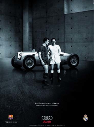 Como no podía ser de otra forma, siendo coche oficial de ambos equipos, Audi ha querido apuntarse al gran clásico del fútbol español que se disputará en unas horas en el estadio del FC Barcelona. En muchos de los diarios de hoy ha aparecido un anuncio a página completa en el que Audi, textualmente, “presenta el clásico”. La verdad es que ese cartel rememorando las viejas glorias tanto de Barça, Madrid, como de la propia Audi, me ha encantado, y es por eso que he creído oportuno compartirlo con vosotros. Después en el campo ya vendrán los malos rollos…