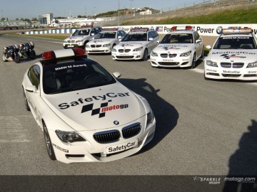 La flotilla de BMW M5 y M6 que acompañarán a los pilotos de motos durante esta temporada por los diecisiete circuitos del calendario han sido desvelados en Jerez. BMW lleva desde 1999 colaborando con el campeonato MotoGP, y ha firmado una extensión del acuerdo por cuatro temporadas más, hasta el fin de 2009. La marca ha lanzado también un concursillo, llamado BMW M Award, que consiste en que el piloto que al final de la temporada haya conseguido el tiempo más bajo de calificación (total), más el tiempo más bajo de los Tests oficiales, se llevará un BMW Z4 M Coupé. La leche, a ver quién se lo lleva. Se admiten apuestas, señores…
