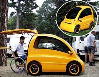 El kenguru, diseñado en Hungría, está pensado para la gente obligada a usar silla de ruedas. No hay asientos, así que la persona se introduce con su silla por la puerta trasera y queda perfectamente colocada delante del cuadro.