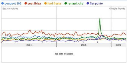 Jugueteando un poco con él se me ha ocurrido ver cuál es el coche más buscado en Internet, restringiendo las búsquedas a España. El experimento ha sido un poco artesanal, probando los más conocidos y dejando sólo los cinco últimos, así que no os extrañéis que haya cometido el error de dejarme alguno importante.