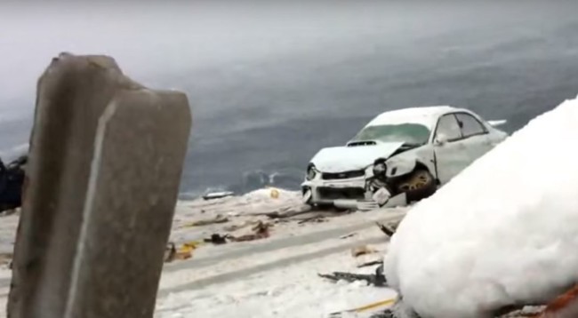 Resulta que hace mal tiempo, incluso nieva y durante el transporte se declara una tormenta. La nieve hace que la cubierta deslice y la tormenta que el barco se mueva para todos los lados... y también los vehículos. ¿El resultado? 52 coches de cabeza a las profundidades marinas y este doloroso vídeo que muestra cómo se golpean y caen al agua.