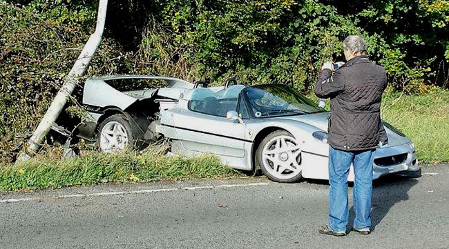 El pasado miércoles por la mañana en las inmediaciones del circuito británico de Silverstone, concretamente en la A43 a su paso por Brackley, el conductor de un flamante Ferrari F50 de color gris tuvo un pequeño contratiempo en un cruce, perdió el control de su supercoche y terminó llevándose por delante una farola, que lógicamente destrozó toda la parte trasera del Cavallino. Al menos eso cuentan los testigos que vieron el suceso.