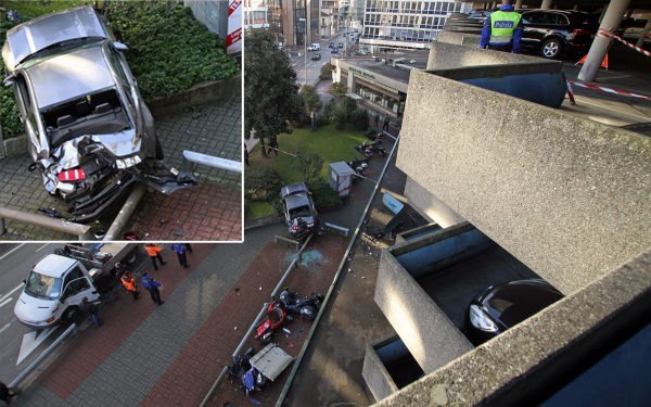 El suceso de la fotografía ocurrió en la ciudad suiza de Lugano, cuando el jóven de veinticuatro años que conducía el Ford Mustang GT debió confundir el pedal del freno con el del acelerador mientras se encontraba en el tercer piso de un aparcamiento, rompiendo el muro de protección y precipitándose al vacío.