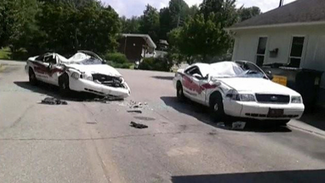 Varios vecinos del lugar llamaron al 911 alertados por unos extraños ruidos que resultaron ser el sonido que hace un tractor cuando pasa por encima de un coche de Policía. Y de otro. Y de otro más. Y así hasta contar siete. Y el Sheriff de Orleans, que fue al lugar donde había dejado el coche, se encontró con que así no tenían modo de perseguir al fugitivo.