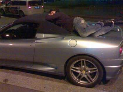 Es desagradable dejar tu coche en la calle y encontrarse algo encima, especialmente cuando tu “coche” es un Ferrari 360 Spider y el “algo” es una persona durmiendo. Más grave aún teniendo en cuenta que como coche es genial, pero como cama no debe de ser muy cómoda.